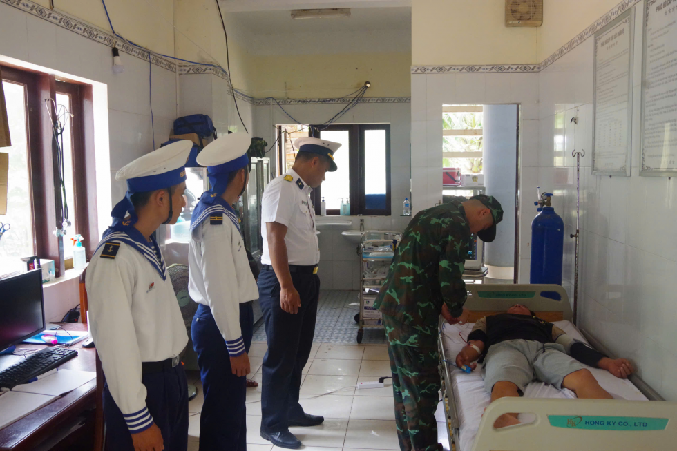 Sau đó, ngư dân Trình được vận chuyển đến Bệnh xá đảo Trường Sa để cấp cứu trong tình trạng tiếp xúc tốt, yếu nửa người phải, sức cơ 3/5.